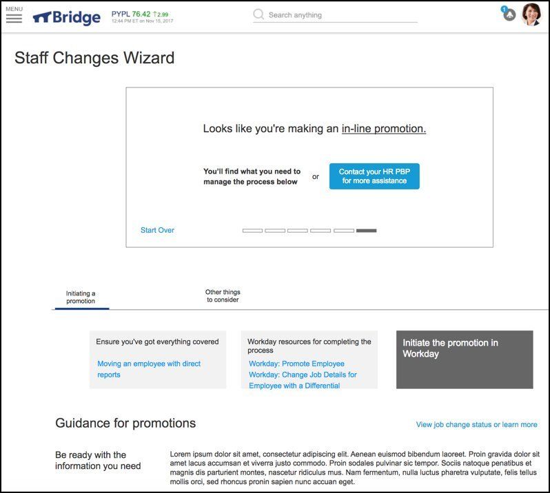 I created a design approach aimed to meet people where they are, anticipating their intent at the point of need and delivering an individualized, ever-present, and eminently convenient experience – like a personal assistant that helps accomplish tasks quickly and guides towards the best outcomes. Analytics and AI-driven insights were used to factor implicit and explicit user data. Combined with qualitative inputs from employees and stakeholders, this data powers an experience that can listen, learn, and adapt to the changing needs of the business and its people.